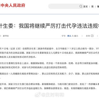 「非法代孕」这个说法在中国是不存在的,所有代孕都明确是非法的,可以参考中国卫计委(现卫健委)前几年的表态(图1)。代孕在医学技术层面上确实没有太大难度,但是继发的一系列伦理和法律问题至今无解。